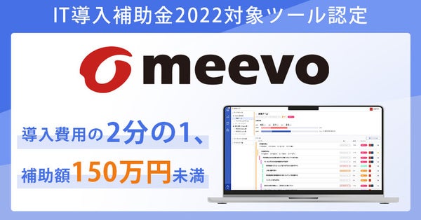 ZUUでは、2021年9月よりPDCA Cloudシリーズの会議版『meevo(ミーボ)』を提供開始しております。リモートワークによる加速するDX化への対応も、『IT導入補助金2022』を活用することで、『meevo』の導入にあたり、導入費用の2分の1(最大150万未満まで)の補助が受けられます。