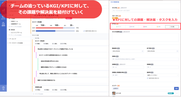 チームのKGI/KPIに対して、課題・解決案・タスクをロジックツリーの形で管理。これにより、チームの全員が何に向けた行動なのかを理解しながら、日々の業務を進めることができます。