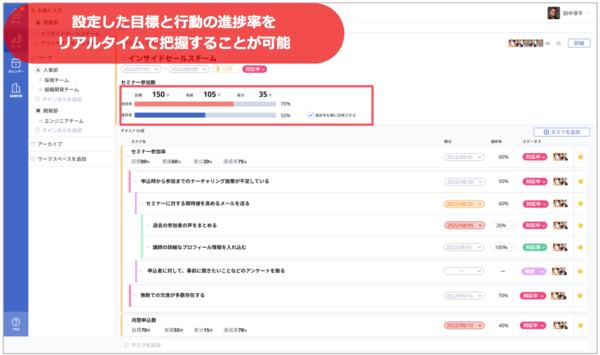 設定した目標と行動に対して、全員が進捗状況を更新することが可能。これにより、リアルタイムでチーム全体の状況を可視化し、改善を回さなければいけないポイントを即座に把握できます。