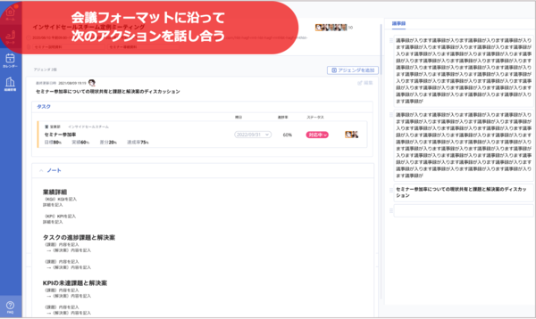 改善を回さなければいけないポイントに対して適切な議論が行える会議フォーマットを用意。これにより、課題・解決案・タスクを確実に議論でき、改善のための次の行動に落とし込むことができます。