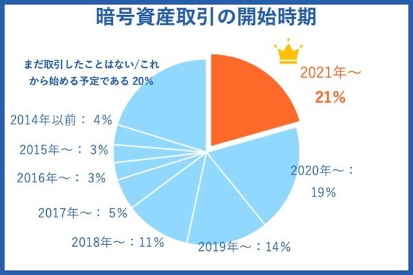 暗号資産の取引を開始した時期は2021年と回答した人が一番多く、全体の21%でした。また、「口座は保有しているがまだ取引をしていない、これから始める予定である」と回答した人も全体の2割いることがわかっています。