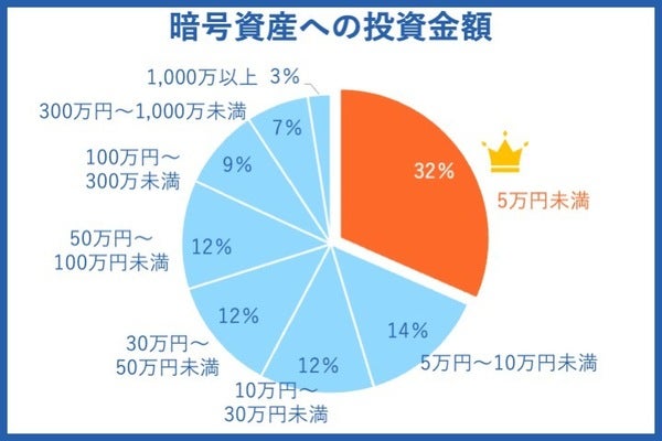 実際に暗号資産に投資している金額は5万円未満の人が32%と最も多く、少額から取引している人が多いことがわかりました。