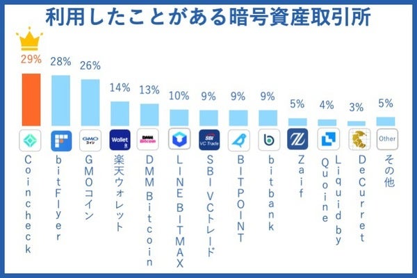 今まで利用したことのある暗号資産(仮想通貨)所は、一番目はCoincheck(29%)で、二番目がbitFlyer(28%)という結果になりました。