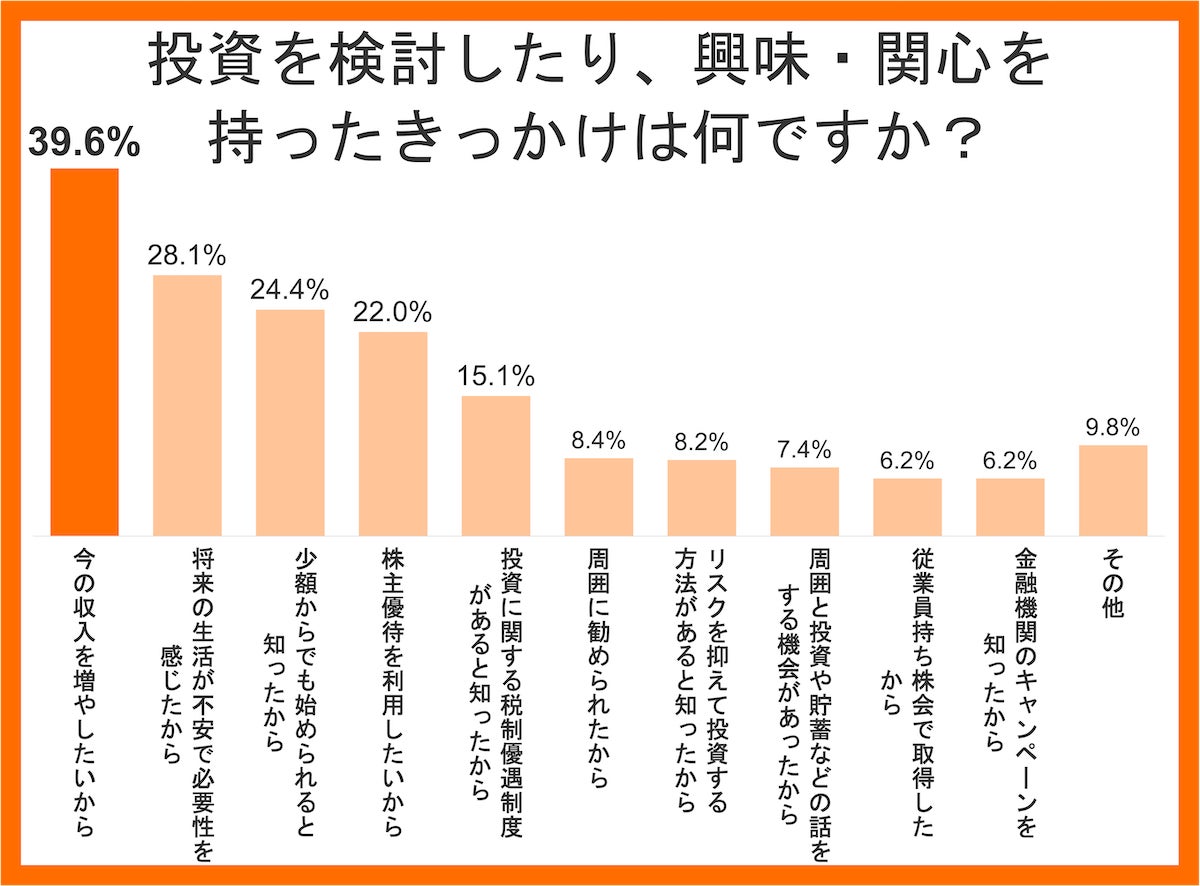 投資を検討したり、興味・関心を持ったきっかけは「今の収入を増やしたいから」が最も多く、2番目に多いのは「将来の生活が不安で必要性を感じたから」でした。