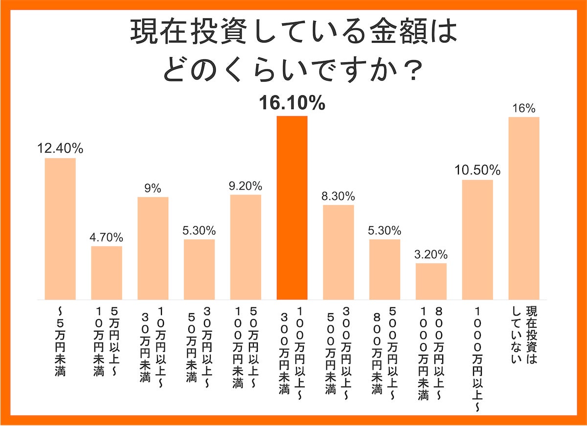 現在投資している金額は「100万円以上~300万円未満」が16.1%で、「現在投資はしていない」が16.0%でした。