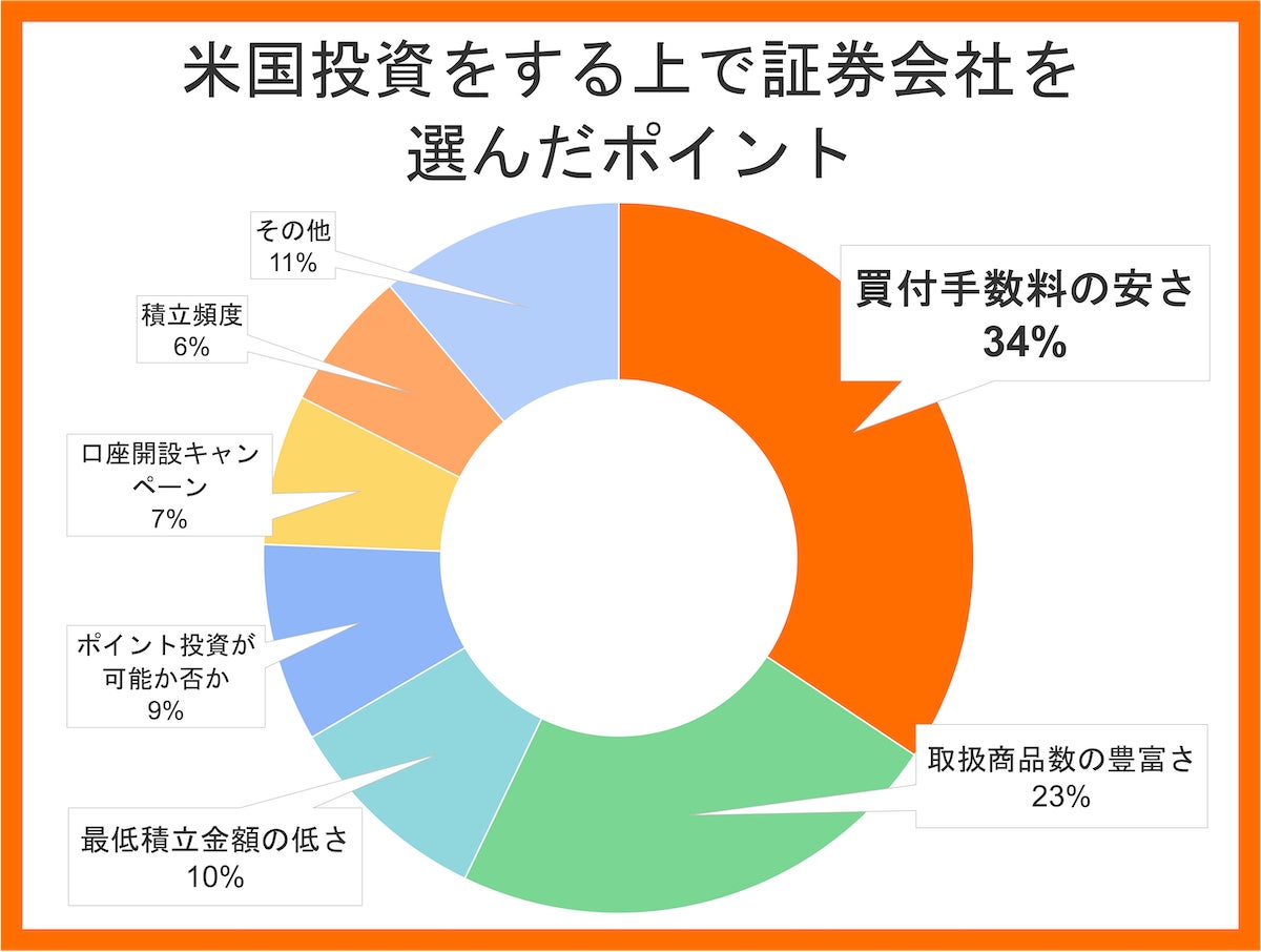 米国株投資を始める際に証券会社を選んだポイントは「買付手数料の安さ」が最も多く、2番目に多いのは「取扱商品数の豊富さ」でした。