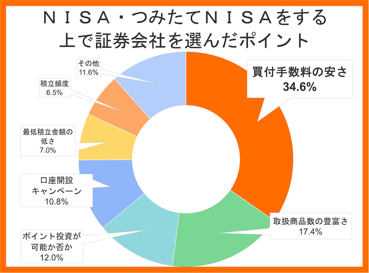 NISA・つみたてNISAを始める際に証券会社を選んだポイントは「買付手数料の安さ」が最も多く、2番目に多いのは「取扱商品数の豊富さ」でした。