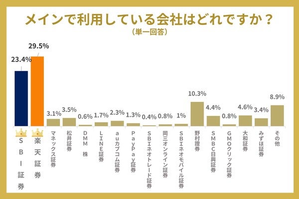 メインで利用されている証券会社でも、一番目は楽天証券(29.5%)で、二番目はSBI証券(23.4%)という結果になりました。