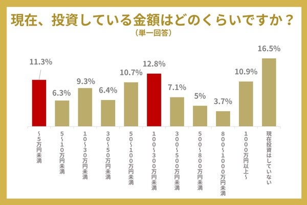 現在の投資金額では、100万円以上~300万円未満と回答した人が12.8%で一番多く、二番目に多かったのが5万円未満で11.3%でした。また、16.5%の人は、現在投資はしていないということがわかります。