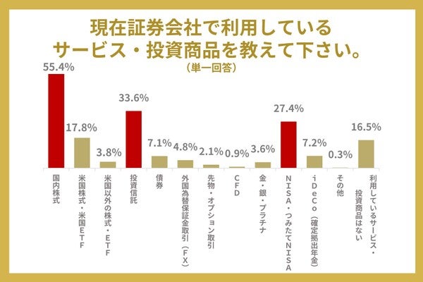 現在利用しているサービス、投資商品で一番多かったのは「国内株式」で55.4%でした。また、二番目に多かったのは「投資信託」で33.6%でした。