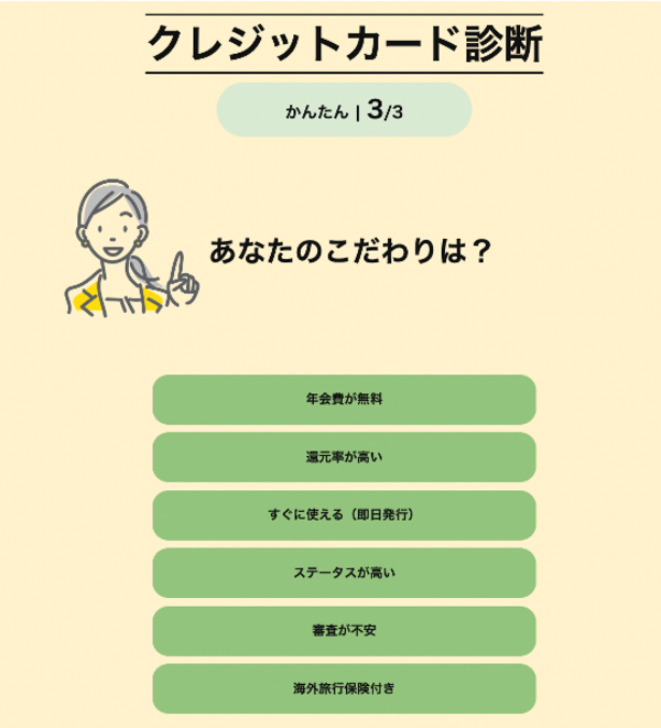 - ・「少しの時間で大雑把に自分に合うものを見つけたい」という方におすすめな、かんたん診断派の方には3問のみで診断完了