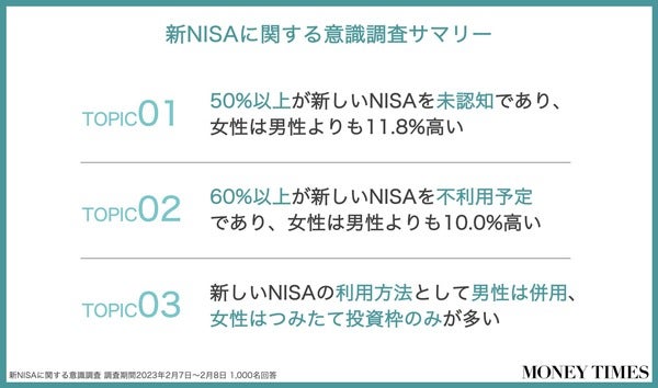 株式会社ZUU(代表取締役:冨田和成、以下「当社」)と株式会社NTTドコモが共同運営する金融メディア「MONEY TIMES™」(https://moneytimes.jp/)は、 新しいNISAについて国内の20歳から59歳の男女1,000名を対象としたアンケート調査を実施いたしました。