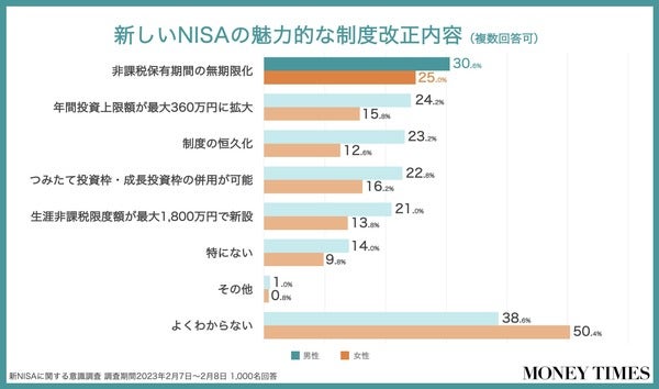 男女共に新しいNISAの魅力的な制度改正内容として「非課税保有期間の無期限化」が1位に