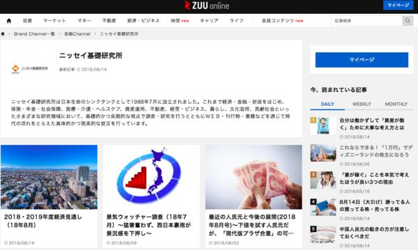 株式会社ZUU(代表取締役:冨田和成、東証マザーズ4387、以下「当社」)が運営する国内最大級の金融メディア「ZUU online」は、企業アカウントである「Brand Channel(ブランドチャンネル)」を株式会社ニッセイ基礎研究所(代表取締役社長:手島恒明、以下「ニッセイ基礎研究所」)向けに開設しました。