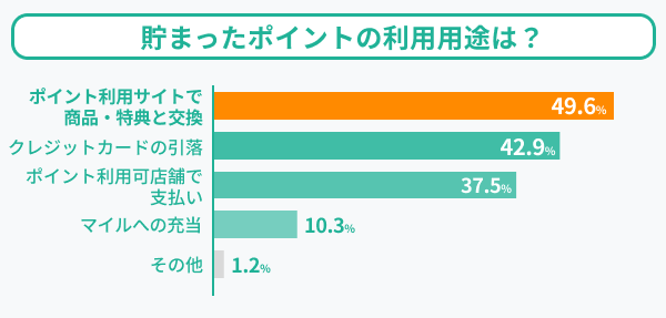 貯まったポイントの利用用途は、1位が「ポイント利用サイトにて、商品や特典と交換」で49.6%、2位が「クレジットカードの引き落とし」で42.9%、3位が「ポイント利用できるコンビニ/スーパー/ショッピングモールで支払い」で37.5%となりました。