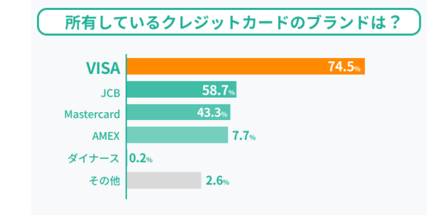 所有しているクレジットカードのブランドでは、1位が「VISA」で74.5%、2位が「JCB」で58.7%、3位が「Mastercard」で43.3%という結果になりました。調査対象者のうちの7割超が「VISA」を選択しており、特に利用者数の多い国際ブランドであることがわかります。