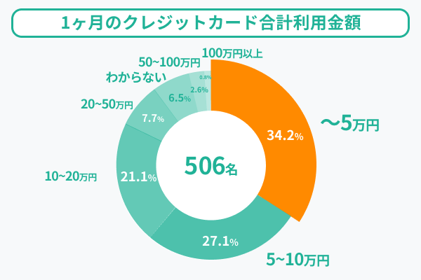 クレジットカードでの1ヵ月の合計利用金額は、1位が「~5万円」で34.2%、2位が「5~10万円」で27.1%、3位が「10~20万円」で21.1%となりました。5万円未満が最も多く、無理のない範囲でクレジットカードを利用していることが伺えます。また、商品購入代金だけでなく、光熱費や通信費などにもクレジットカードを利用する場合、2位と3位の「5~20万円」にボリュームが集まることも納得できます。