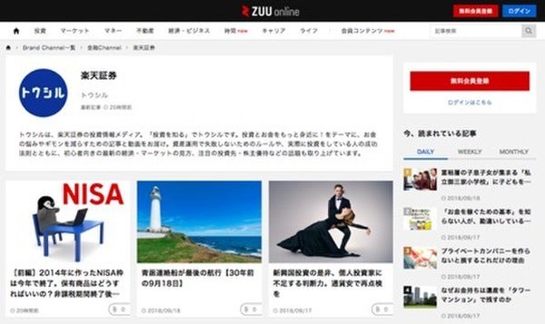 株式会社ZUU(代表取締役:冨田和成、東証マザーズ4387、以下「当社」)が運営する国内最大級の金融メディア「ZUU online」は、企業アカウントである「Brand Channel(ブランドチャンネル)」を楽天証券株式会社(代表取締役社長 :楠 雄治、以下「楽天証券」)向けに開設しました。