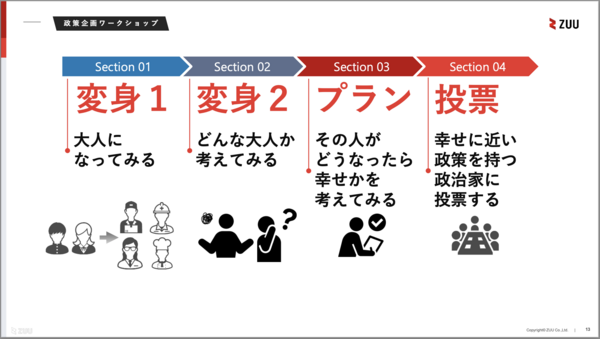 本プログラムは、成人年齢が18歳に引き下げられ、身近になった政治を題材に、社会課題への理解を深めつつ、主体的に社会課題に挑む姿勢を身につけること、また多角的な視点で考えることで、自分とは異なる意見が存在し、また尊重されるべきであることを理解する目的で作成しました。