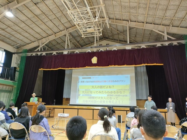 政治家に扮した劇団員が子供達が考えた政策を取りまとめ、「文化・スポーツ」や「福祉」などのカテゴリごとに演説。子供達は、自分の考えたキャラクターや周りのキャラクターの困り事を一番解決してくれそうな政治家に投票しました。