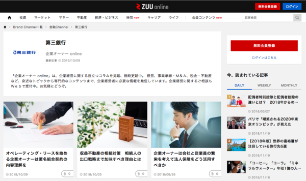 月間400万人のユーザー数を誇る「ZUU online」上にパートナー向け企業アカウントである「Brand Channel(ブランドチャンネル)」を第三銀行向けに設置し、第三銀行が運営する企業経営者が必要とする企業経営に関する情報を、様々な角度から分かりやすくコラム記事形式で伝える「企業オーナー online」と連携します。「企業オーナー online」は事業承継や M&A、経営改善、法人保険、収益不動産など、身近なものから専門的なものまで、幅広いカテゴリーの情報を、忙しい経営者の方でもwebから手軽に情報収集が行えるように運営しています。