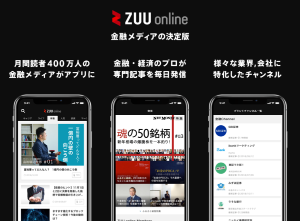 資産運用に関する総合プラットフォームを運営する株式会社ZUU(代表取締役:冨田和成、東証マザーズ4387、以下「当社」)は、月間400万人を超える金融メディア「ZUU online」のスマートフォンアプリ(iOS版)を2019年1月1日(火)に正式リリースしたことをお知らせいたします。