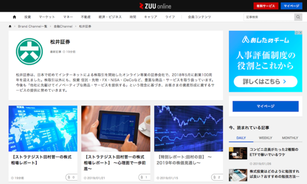 株式会社ZUU(代表取締役:冨田和成、東証マザーズ4387、以下「当社」)が運営する国内最大級の金融メディア「ZUU online」は、企業アカウントである「Brand Channel(ブランドチャンネル)」を松井証券株式会社(代表取締役社長:松井 道夫、以下「松井証券」)向けに開設しました。