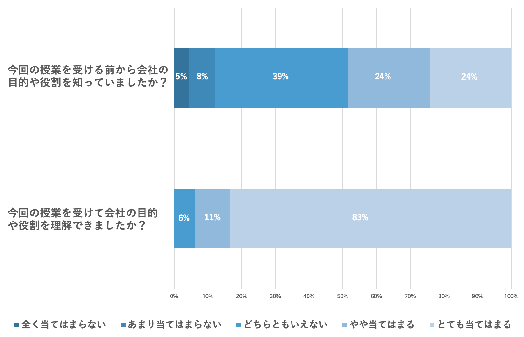 ・授業を受けた生徒の83%が会社の目的や役割についてよく理解できたと回答