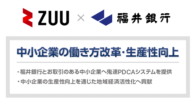 本提携では、福井銀行とお取引のある中小企業に対し、当社が提供する「鬼速PDCAシステム」(及び、付帯する組織コンサルティング)の導入を推進することで、金融、組織の両面から中小企業の成長をサポートし、地域経済活性化への更なる貢献を目指します。