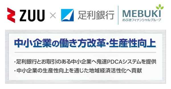 この度、株式会社ZUU(代表取締役:冨田和成、東証マザーズ4387、以下「当社」)は、株式会社足利銀行と中小企業の組織マネジメントに関する課題を解決・支援するため業務提携を行いました。