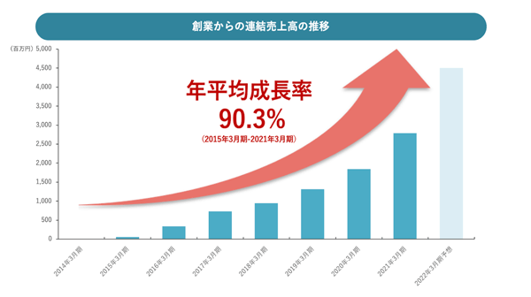 創業から2021年3月期まで年平均成長率(CAGR)90.3%と高成長を維持