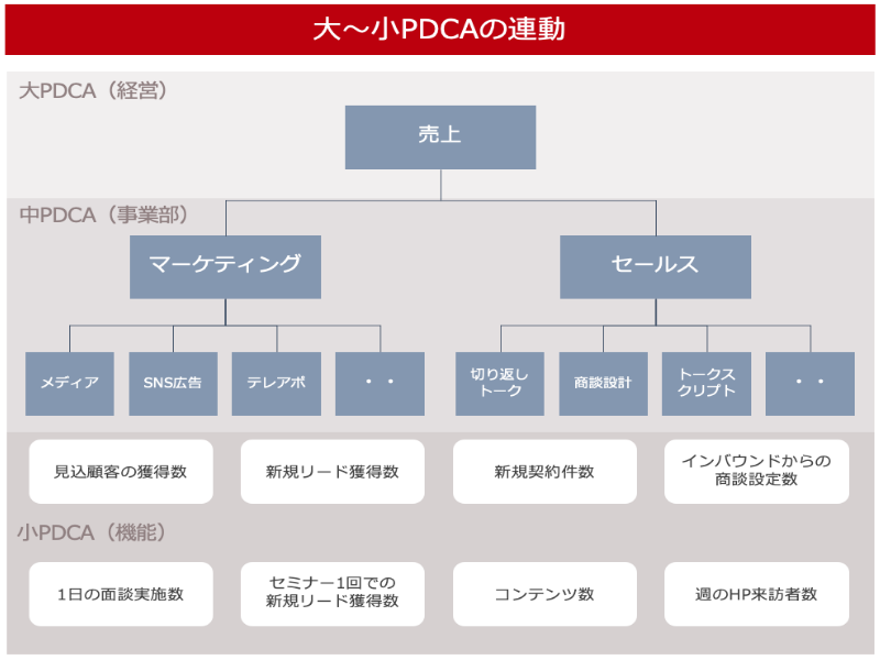 社長の大戦略を、幹部レベルが「解決すべき重点課題ごとの中戦略」を策定し、それを因数分解することで実行可能な「行動計画」を策定。また、あらゆる業界・業界1,000以上のKPIを可視化してきた実績とデータベースをもとに、社員が未熟でもPDCAが回る仕組みを構築し、重要KPIの改善/達成を実現します。
